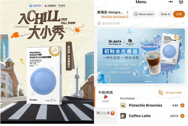 通過聯(lián)合地理學(xué)家咖啡打造“初秋水光邂逅”快閃店,推出「初秋水光邂逅」面膜x地球融化拿鐵主題套餐,讓 “一杯水光飲,一刻水光肌”成為標(biāo)配,將護(hù)膚從“居家場(chǎng)景”延伸至“社交場(chǎng)景”。