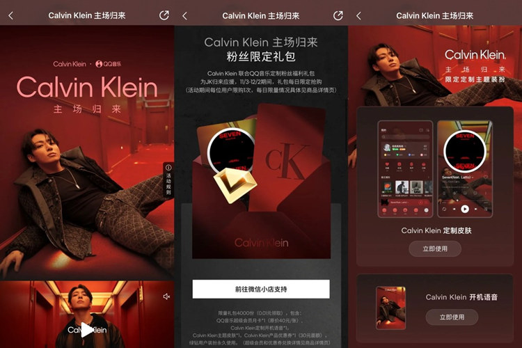 本次活動包含Calvin Klein定制開機語音閃屏、Calvin Klein定制皮膚裝扮等主題限定裝扮,以及「Calvin Klein主場歸來」限量粉絲禮包。其中最引人注目的“可轉贈”機制,正悄然改變音樂平臺粉絲經濟的運營邏輯。而選擇CK作為聯合發起方,則是本次合作能夠迅速“擊穿”粉絲圈層,并產生廣泛回響的關鍵戰略布局。