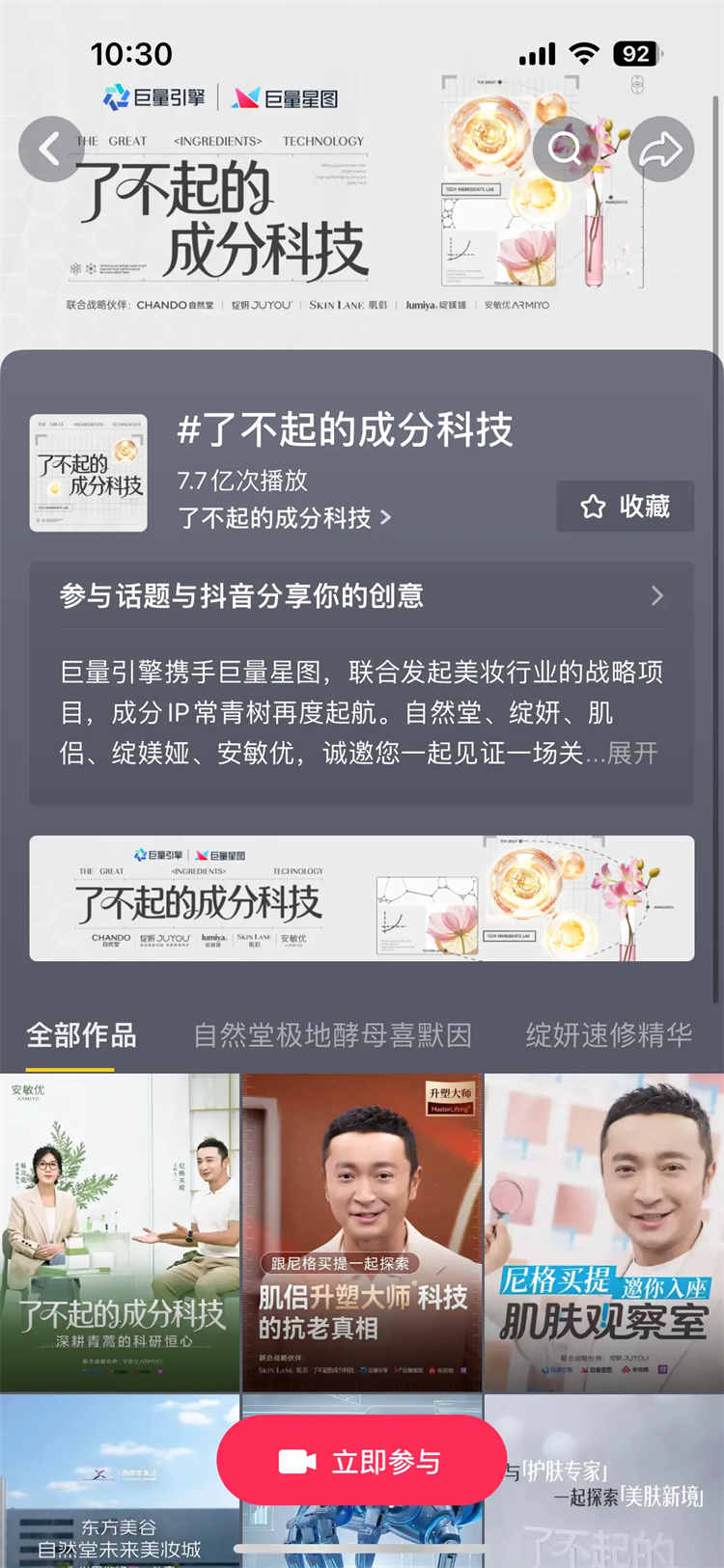 光看懂還不夠,得讓人信,項目直接拉滿頂格信任!先是聯(lián)動皮膚科專家推出先導(dǎo)片,不搞空泛解讀,而是就大眾所關(guān)心的【都是你想問】護(hù)膚知識,展開深度解讀,看個短視頻輕松學(xué)到不少護(hù)膚知識,最重要的是皮膚科專家免費(fèi)給上課。同時還拉上了央視文藝、央視頻權(quán)威背書,直接把成分科技的可信度抬到國民級高度。